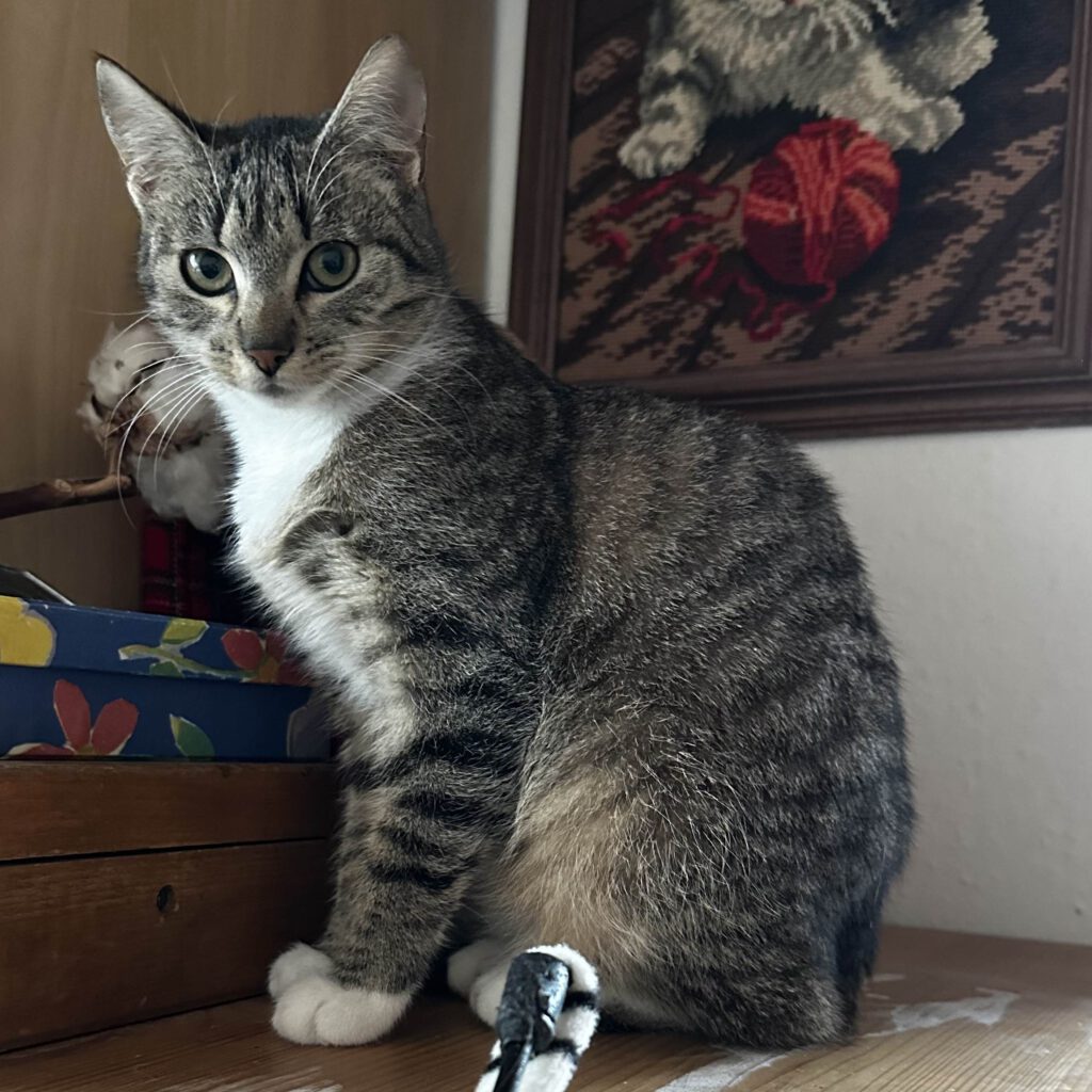 Zuhause angekommen richteten wir umgehend ein Quarantänezimmer her und ließen die Katzen in Ruhe ankommen. Der Hunger war groß – zuerst stürzten sie sich auf das Futter. Besonders berührend: Das kleinere Kätzchen zeigte sich erstaunlich zutraulich und ließ sich sogar vorsichtig streicheln.
