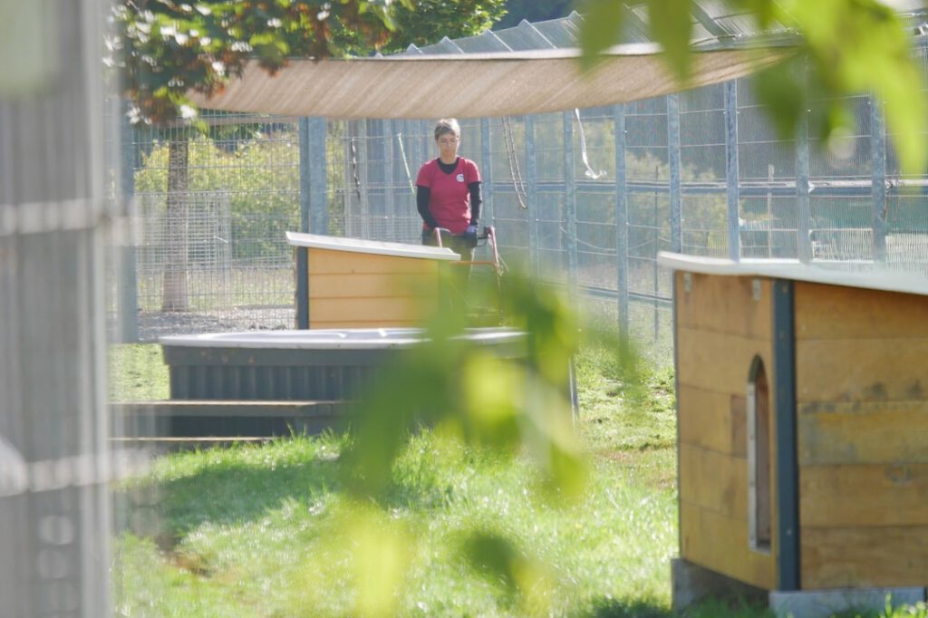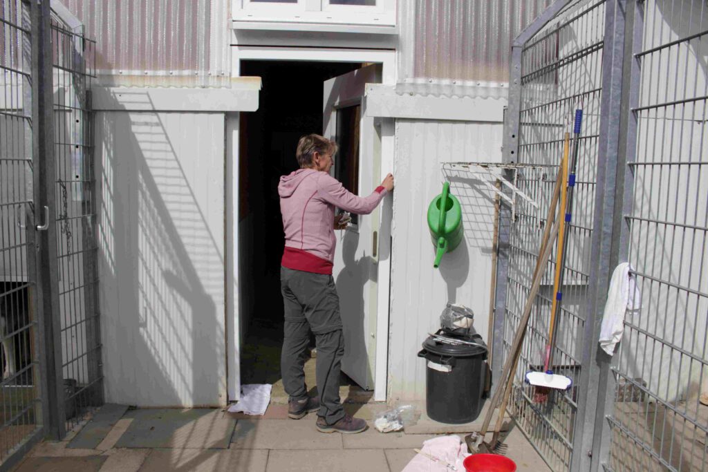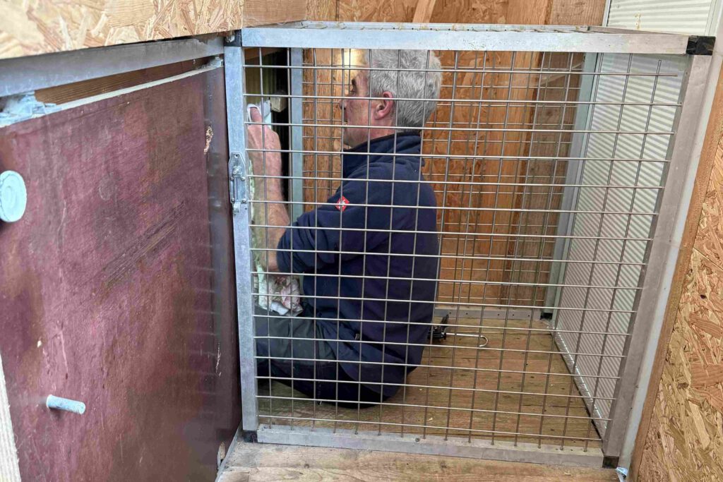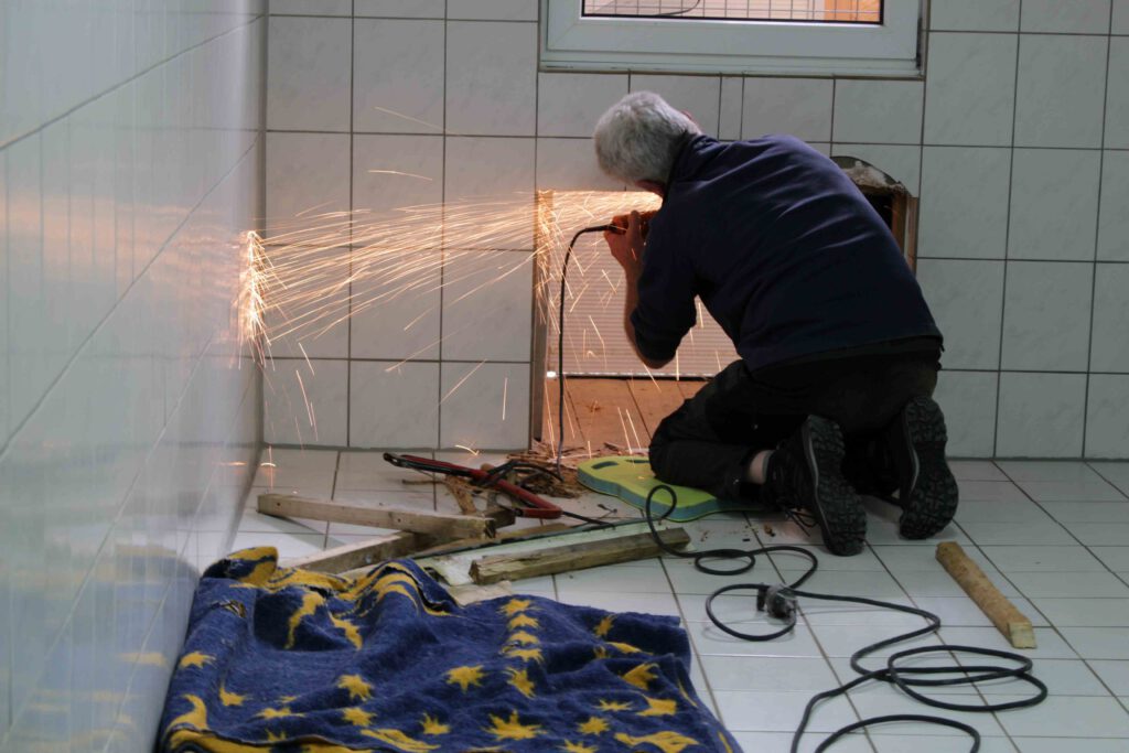 Im Haus 5 stehen einige Arbeiten an. Seit Rubio ausgezogen ist, haben wir hier freiere Bahn. Zuerst wurde der Tunnel ins Außengehege optimiert. Zum Start der Baumaßnahme produzierte Werner ein Feuerwerk und setzte dann neue Leisten am Übergang zum Tunnel ein. Dazu muss der Handwerksmann auch mal selbst im Käfigtunnel sitzen.
