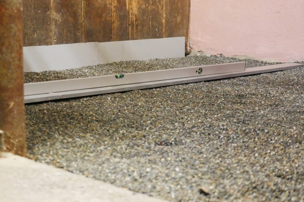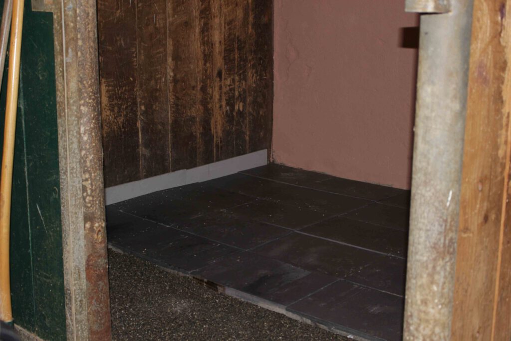 In der Pferdebox mit unbestimmter Bestimmung – es gibt so viele Möglichkeiten- wurde der Split ordentlich im Wasser ausgerichtet und danach mit Betonplatten belegt.