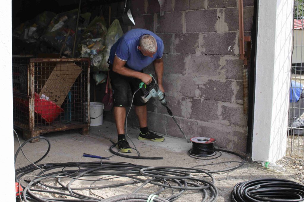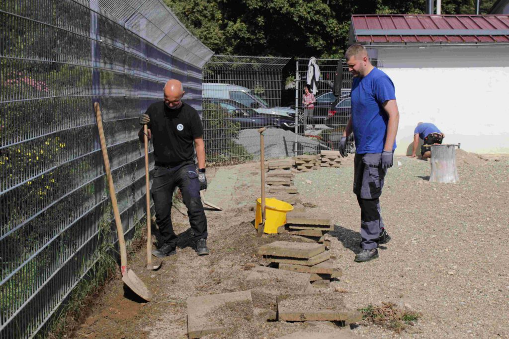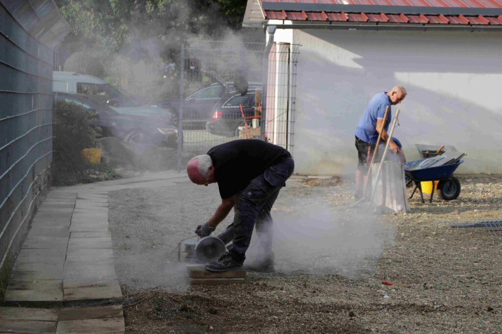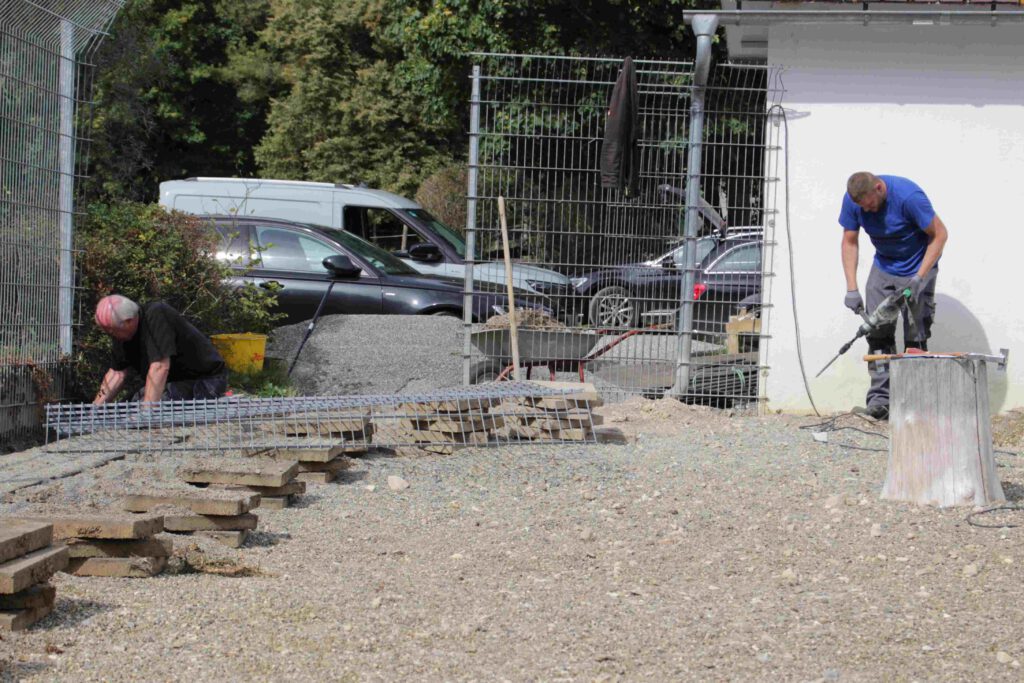 Beleuchtungsmasten brauchen Stromkabel. Stromkabel brauchen Kabelwege, manchmal Kabelgräben. Die versierte Mannschaft stellte den Kabelweg von der Garage zum Kabelgraben her und führte ihn weiter zum Stellplatz von Mast 1 am Gehege 1. Danach wurde alles wieder zugebuddelt und mit den sorgsam gestapelten Betonplatten wieder gedeckelt.