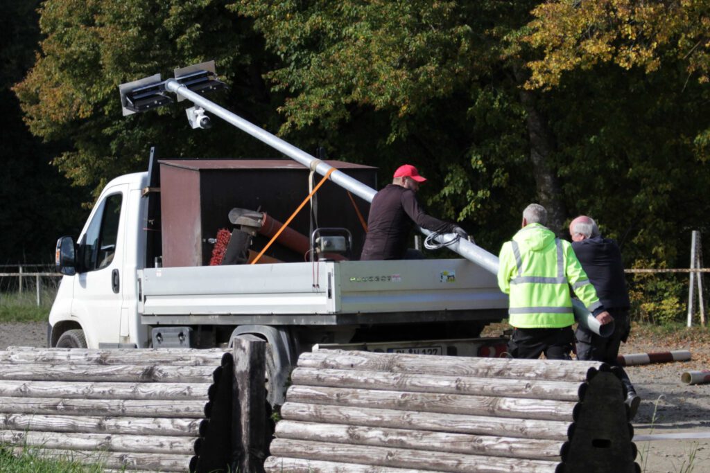 Ebenso entspannt verlief der Transport des auf dem LKW verzurrten 2. Masts. Im Schritttempo wurde er zur Westseite der Gehege gefahren und stand wenige Minuten danach. Samstags verklemmte Claus noch alle Kabel an den Masten und schloss die Deckel. Wir waren sehr zufrieden mit dem Ergebnis!