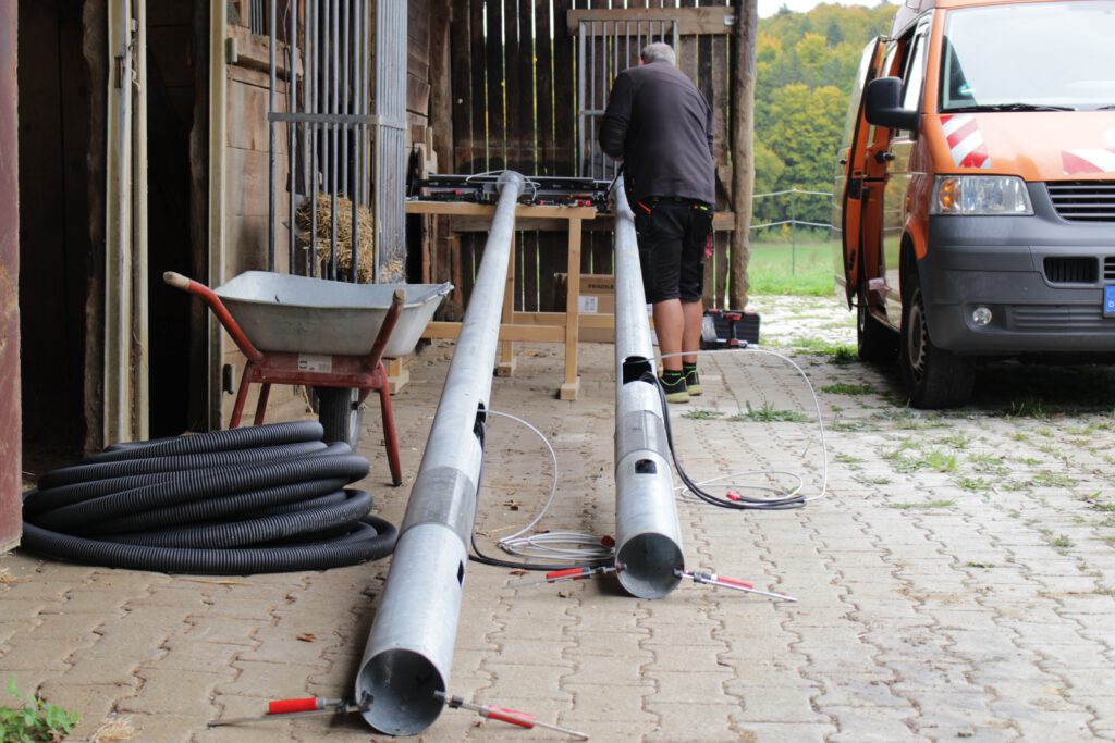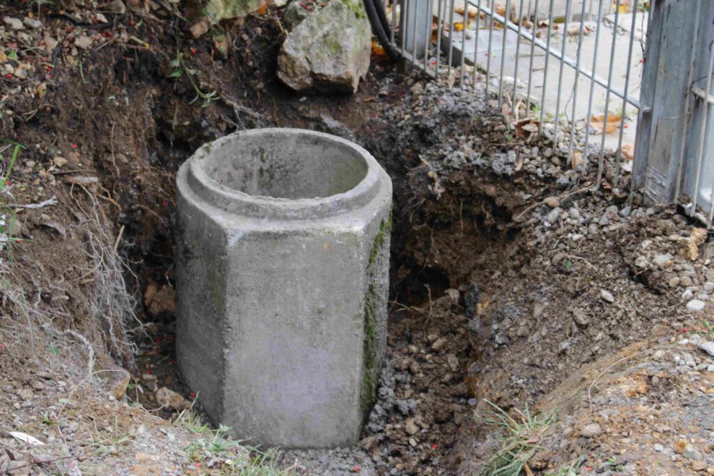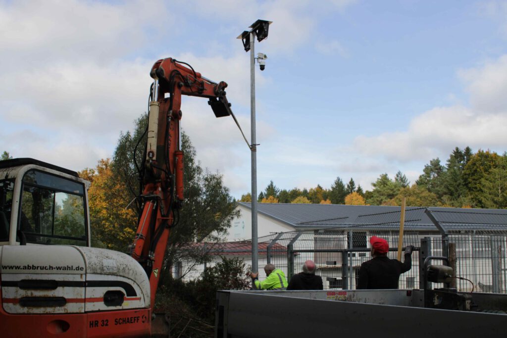 Freitags wurde es dann spannend. Der Graben im Osten wurde gefüllt, danach konnte es ans Aufstellen der Maste gehen. Das hat mittels Bagger super funktioniert! In Ruhe konnten die Kabel eingefädelt und der Mast ausgerichtet werden. Abschließend wurde das Betonrohr mit Sand aufgefüllt, der noch verdichtet wurde.