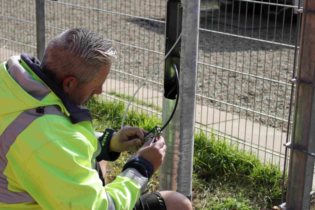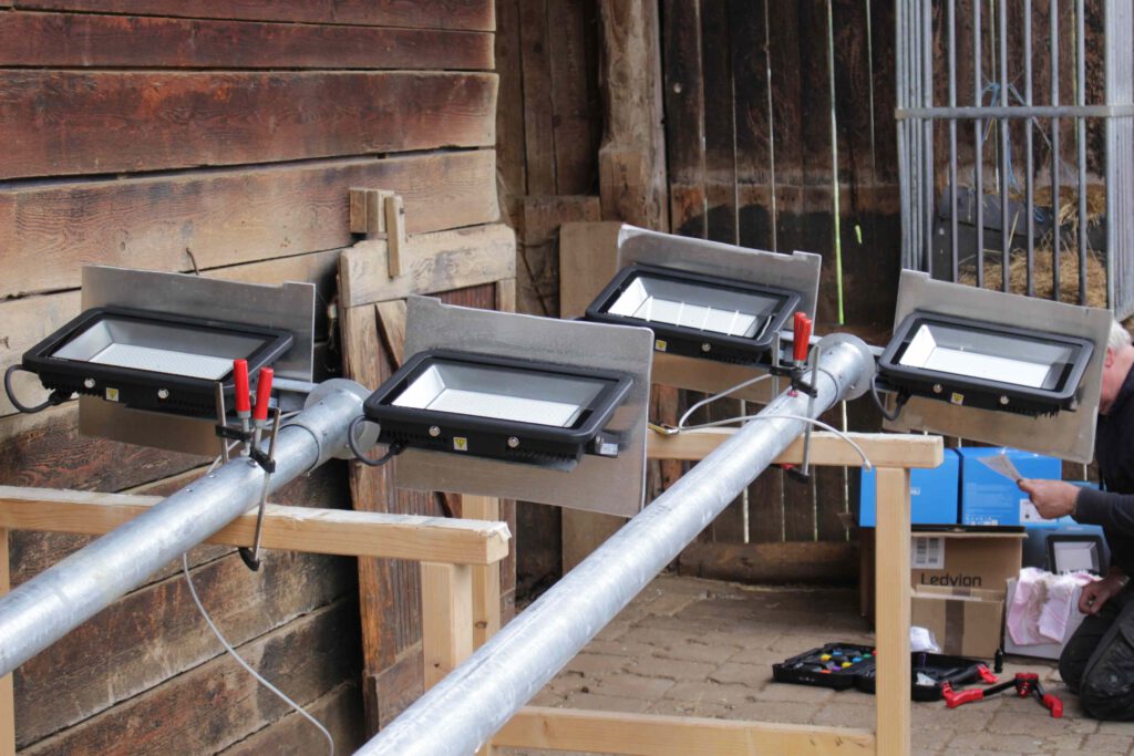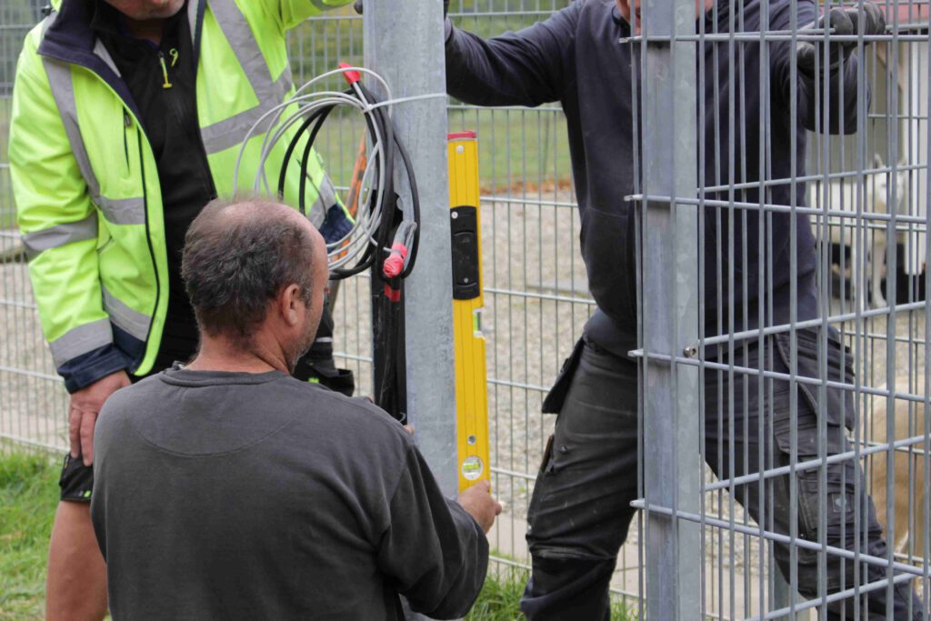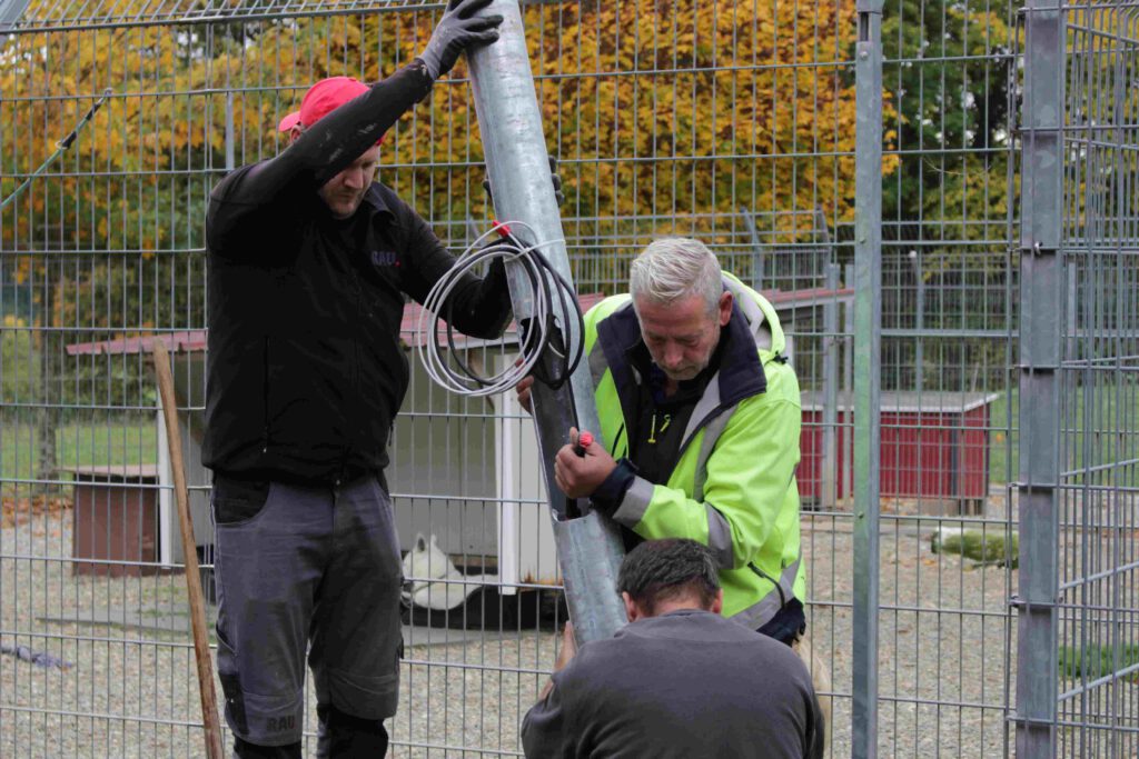 Am Donnerstag kam weitere Unterstützung durch unseren ehrenamtlichen Elektromeister. Zwei Männer verlegten Kabel in den Gräben und den Masten. Auch die Strahler wurden vormontiert. Unsere Hunde beobachteten gespannt das Geschehen, Willow bewarb sich gleich mal für die ‚Bauaufsicht‘.