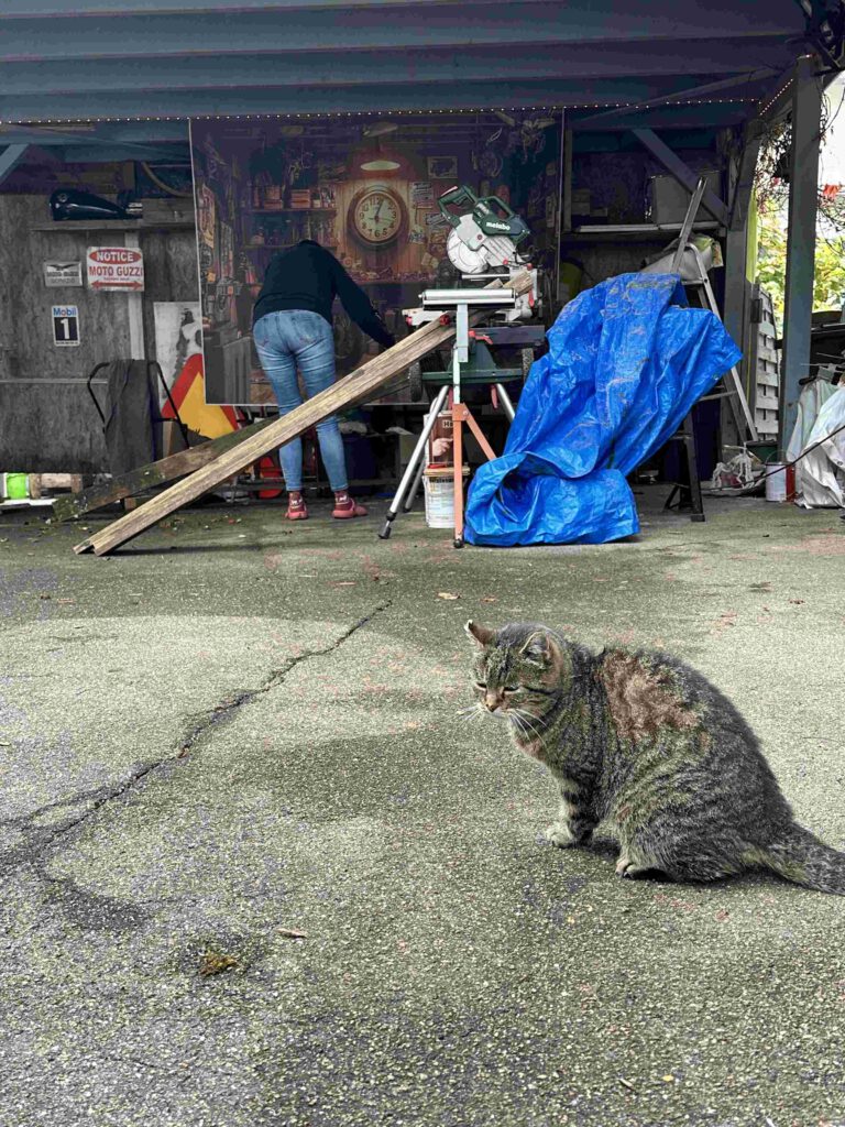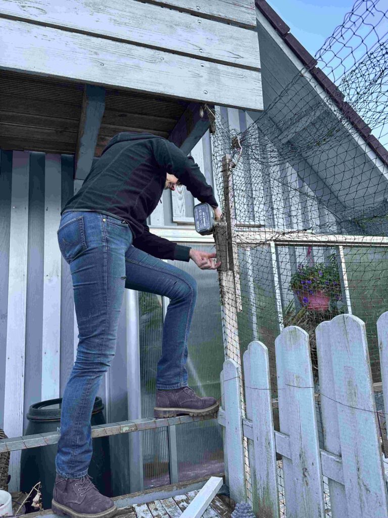 Das Gehege ist für meine Pflegekatzen ein ganz besonderer Ort: Hier können sie frische Luft schnuppern, die Sonne genießen, den Vögeln zusehen und einfach Katze sein – sicher und geschützt. Doch nach vielen Jahren intensiver Nutzung war der Boden leider marode und matschig geworden, und auch das Schutznetz hatte seine besten Tage hinter sich. Für Mensch und Tier war das einfach nicht mehr tragbar. Sindy übernahm die ‘Bauaufsicht’.