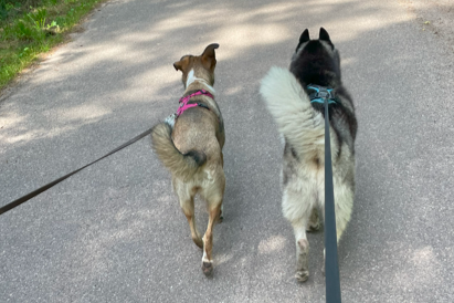 Wald gibt’s hier auch jede Menge. Mit dem Opa Arlo klappt das auch super. Wir fressen mittlerweile nebeneinander – jeder aus seinem Napf. Die Abendrunde starten wir gemeinsam. Arlo kürzt dann halt ab.