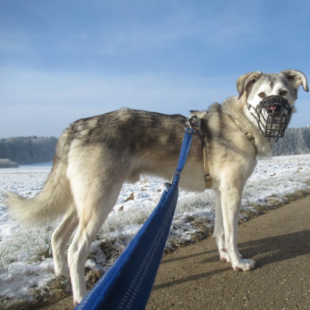 Das macht den Maulkorb bis auf weiteres in den Übungen notwendig, denn Oles bisheriger Lösungsansatz, aus solchen Situationen herauszukommen, war vermutlich bzw. ist offensichtlich aktuell Aggression. Damit hat er bei uns aber keinen Erfolg. Denn dieses Verhalten ist im familiären Zusammenleben nicht tragbar und reduziert seine Chancen auf eine neue Familie erheblich. Wir bieten ihm jetzt Raum für alternative Lösungsstrategien.
