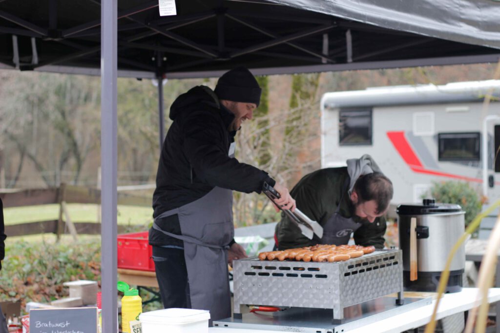 Samstagvormittag: in der Halle herrscht noch wuselige Betriebsamkeit, vor dem Eingang wird angegrillt. Denn viele Gäste waren bereits auf der oft längeren Anfahrt und kamen hungrig an. Darauf waren wir vorbereitet. Es gab wieder Deftiges vom Grill, vegetarische Suppe und ein großes Angebot an bestem Kuchen und Waffeln.