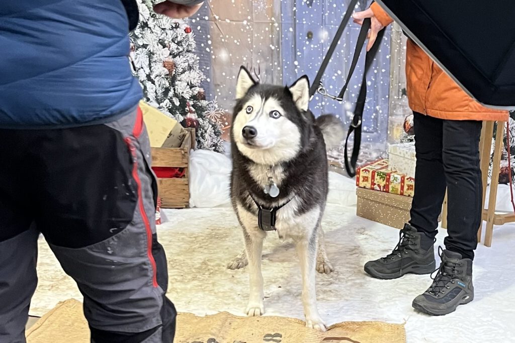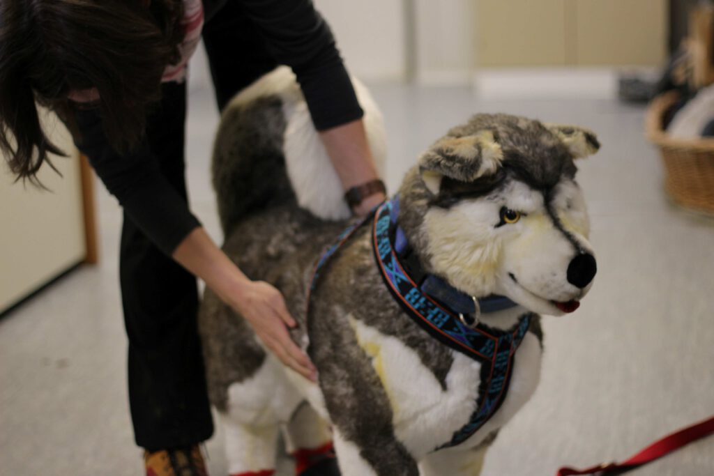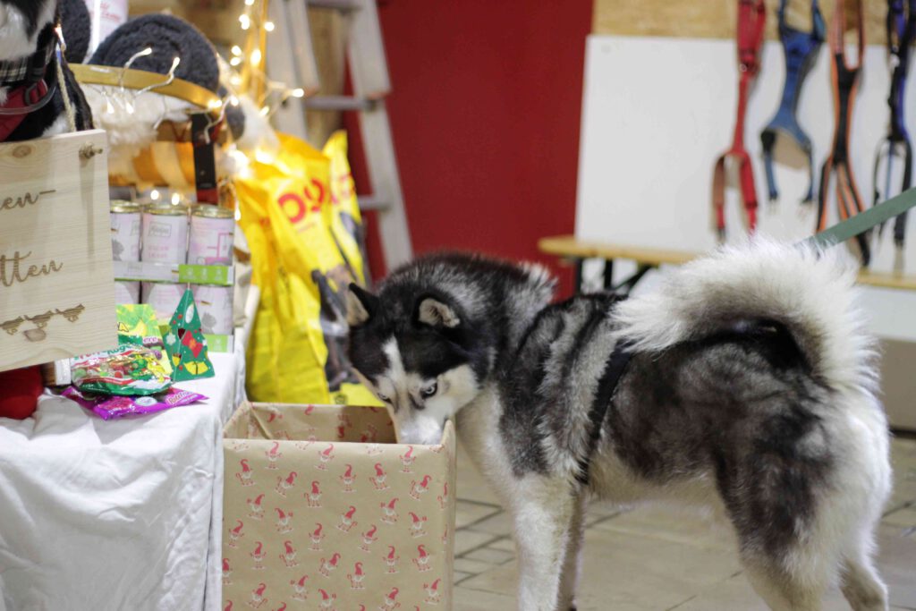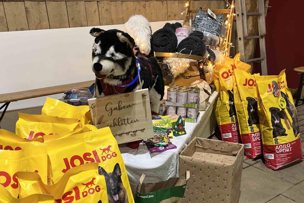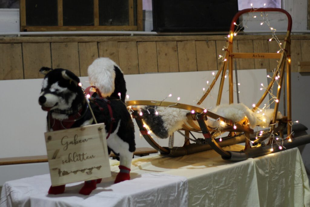 Unsere Helfer auf dem Parkplatz hatten viel zu tun, denn rund 250 Gäste füllten das Gelände im Zulauf zur Station mit ihren Fahrzeugen. Auch unsere Plüschhuskys, die ganzjährig im Nothilfeshop tätig sind, hatten eine besondere Herausforderung. Winston musste allein den Gabenschlitten ziehen, da Willow bei Elkes Vortrag ‚erste Hilfe für Hunde‘ assistierte. Wir hatten Informatives rund um unsere Arbeit vorbereitet und ein großes Angebot von Nützlichem und Geschenkideen fürs Mensch-Hunde-Team. So mancher Husky verließ am Abend den Hasleberg neu ‚eingeschirrt‘, seine Familie mit einem ausgefallenen Erinnerungsfoto oder wärmenden Accessoires und natürlichen handgefertigten Dekos.