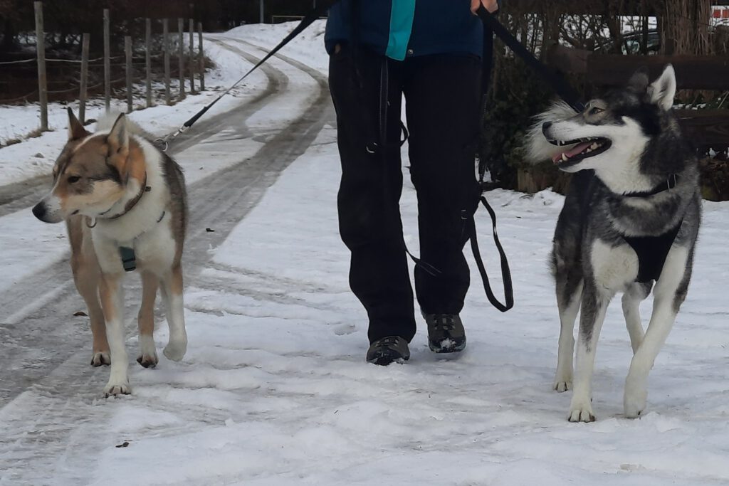 Kaum hatten wir Yuma in der Homepage vorgestellt, meldete sich eine Freundin der Nordischen. Sie war auf der Suche nach einer hündischen Partnerin für Jack, den sie im April 2025 von uns adoptiert hatte. Die Chemie war bald geprüft, alle drei waren sich sehr zugeneigt. Danach gab es immer wieder Besuche auf dem Hasleberg mit gemeinsamen Unternehmungen. Ein längerer Urlaub wurde zur Eingewöhnung geplant und Yuma durfte Anfang Januar 2026 mit in die Schweiz umsiedeln. Auch zuhause funktioniert das gemeinsame Leben sehr gut und die drei sind bereits sehr glücklich zusammen. Vielleicht bekommen wir mal Post? Auf jeden Fall sehen wir uns sicher bald wieder. Bis dann…